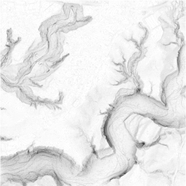 How does an uneven white surface shade on a cloudy day? Steeper areas with more of the sky occluded are darker while wide open spaces, like the bottom of river valleys and the tops of ridges and plateaus are brighter.  If you want to witness this effect, look to snow on the ground on a cloudy day (and what a great winter to do it).  (The only difference with snow is subsurface scattering which evens out the light quite a bit.)  You’ll notice the divots in the snow to be darker than the peaks, and the edges of the divots to be darkest of all.