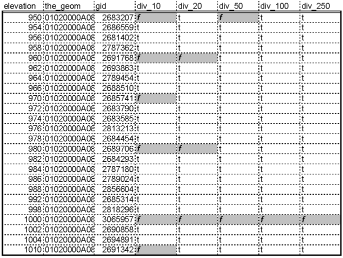 To structure the table, we could be disciplined and build this out as a proper normalized relational dataset where our gid is used to determine if a contour is divisible by 10, 20, 50 etc., and while “I don’t wanna” isn’t a good enough reason not to do this, I think the computational overhead of a database view piecing these data back into a single table each time we need to access this would not be justified in the light of the static nature of the table. So database normalization be darned, disk space is cheap, full speed ahead. Let’s add some boolean fields for flagging whether a contour is divisible by our numbers and calculate that out: