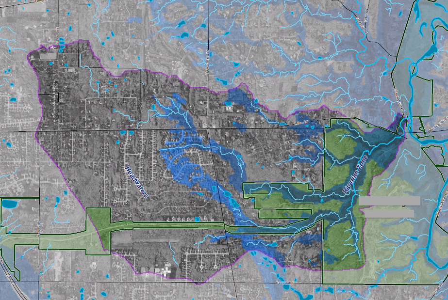 I didn’t use PostGIS Raster, but the incredibly useful gdal_calc.py to finish out my landscape position calculations. I will endeavor to post my code to github soon, but the parts and pieces include using gdal and PovRay. PovRay helps with the sampling (really!) of nearby neighbors in the raster DEM, and gdal does the averaging and differencing of those to get relative landscape position. I spent some time yesterday scratching my head over how to show all the new landscape position information on a readable and useable map, and after discussion with collegues, decided to use it to divide the world into two categories– riparian & lowland + headwaters & upland (not reflected yet in the labels). To find out more about landscape position, follow this link, or better yet this one. (BTW, the green is park land, blue is riparian/lowland/stream networks, purple is the basin boundary).