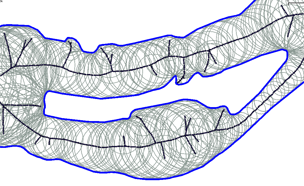 I didn’t remember that I had 4 previous post on this topic, but I’ve gotten a little obsessed with this problem– how to (with relatively little computational cost) kind the centerline of complex polygons, so we can extract flow lines from streams, label long complex polygons, easily generate the centerline parcel boundary line for river bound parcels, etc.. FYI, here are my 4 previous posts on this topic: