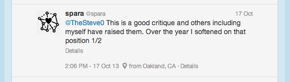 The core idea being civic hackers should be providing tools that can be changed and adopted by the municipality. Responses on twitter have varied, with a nuanced response from @spara: