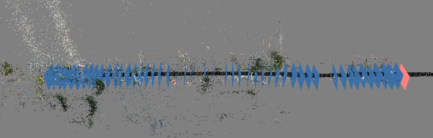 The clump of red shows a clear issue of overlapping points. As these points are the GPS positions of photographs, we can match features between photographs (using structure from motion) to map out the relative location of these photos to each other. The points in the below figure show the matched points in 3 or more photos, the blue shapes represent camera positions within the scene.