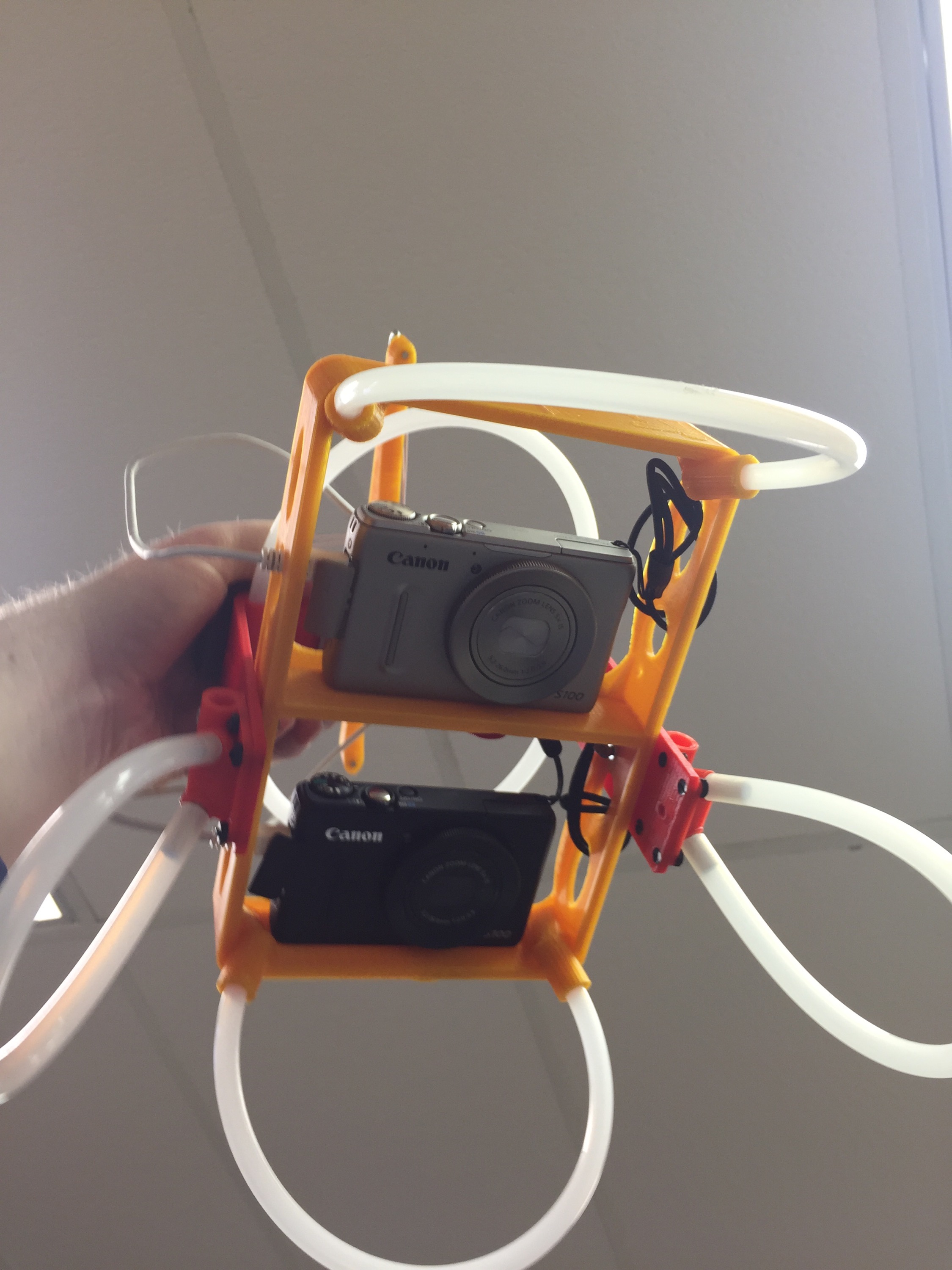 Inflation of aerostatThe aerostat hanger.The end of the string.The 9-footer is just so stable. But not enough wind to lift the cameras this day.And so we send up the 16-foot workhorse. See that little dot? That’s the camera array.The 16-footer flew nice and vertical, but pulled really hard. Processed images to follow soon.Canon S100s from Kaptery — the silver one is an NIR adapted one; the black one is RGB color.