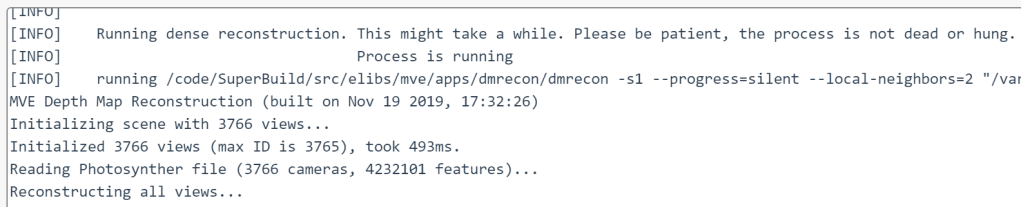 The depthmaps that are running are being done in MVE, which can give us really detailed information about progress, but unfortunately, it makes logs a real mess, so we have it logging nothing. Let’s see how we can get around this and check in our status.