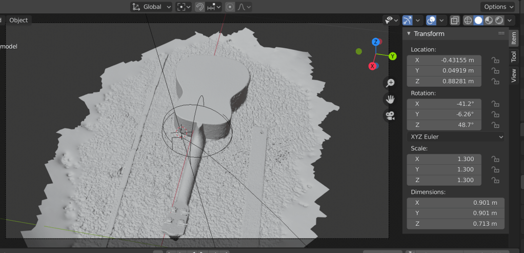 One challenge of working with unreferenced data in structure from motion is giving those data reference and context. For the original ukulele reconstruction, I started with an unreferenced model, which OpenDroneMap outputs, imported that into blender (with the File:Import:Wavefront (.obj) option and manually rotated, translated and scaled it into my scene. This meant rotating it quite a bit on all three axes and moving the model a bit to get it where I wanted it in the scene.