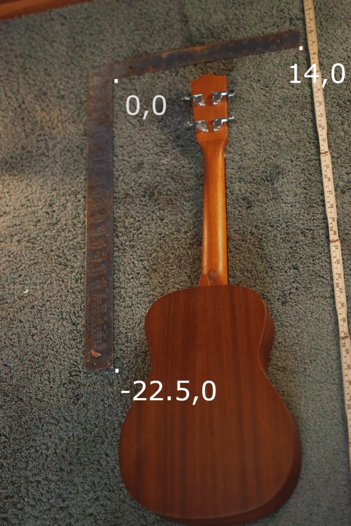 To accomplish this, I just included a literal scale in the pictures. In the upper left, you can see a builder’s square I pulled from my shop (kinda rusty, eh?) and put down next to the Uke. I set the corner as 0,0 and then figured out the offsets for two other corners, which were 14 and 22.5 inches away.